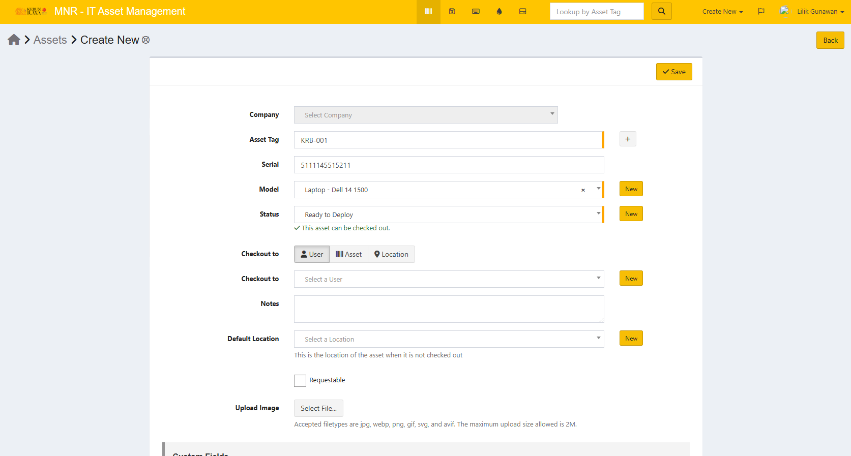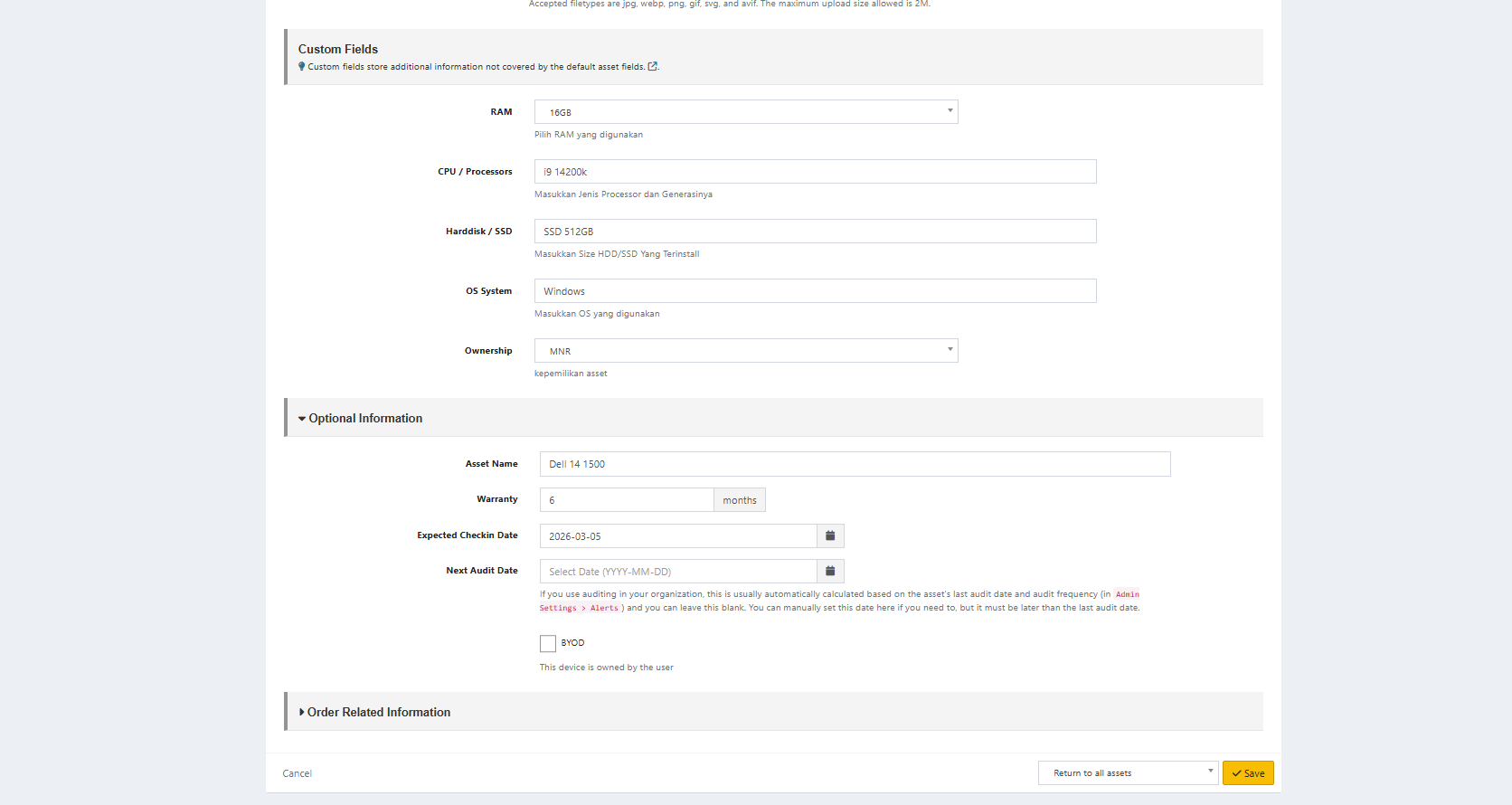 • Berikutnya silahkan isi asset name sesuai nama asset tersebut dan isi Waranty jika memang ada.