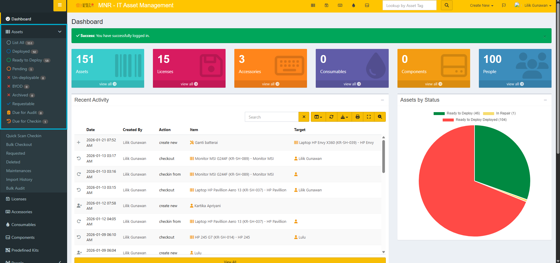 • Ready to Deploy : Aset yang siap digunakan atau dipinjamkan, tetapi belum diberikan ke user.